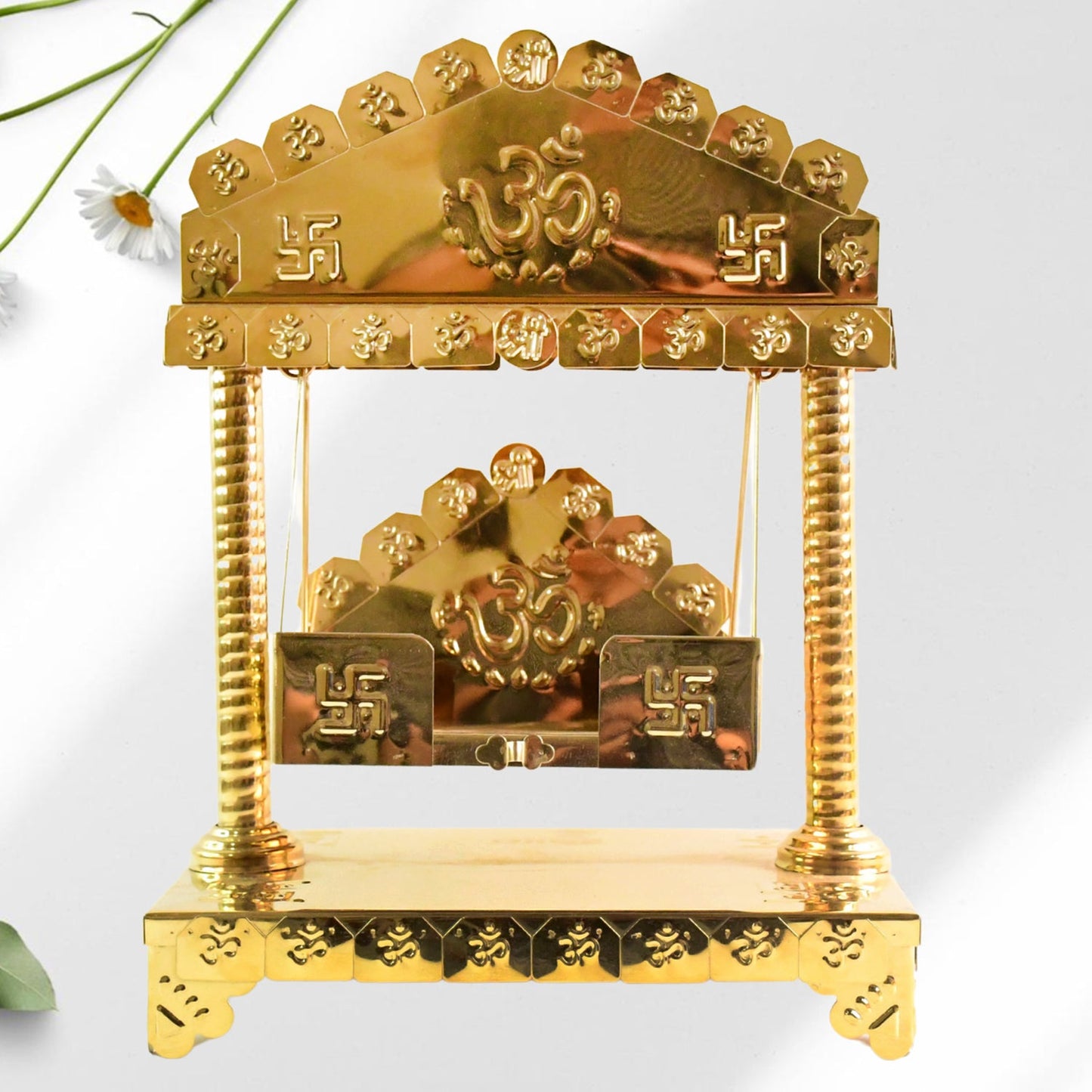 Crafted from durable metal and coated with a rich golden brass finish, each swing features ornate engravings of sacred Hindu motifs like 'ॐ' (Om) and Swastik, both symbolizing peace, positivity, and good fortune. The miniature swing is supported by finely sculpted side pillars and a stable base, mimicking a miniature temple architecture. A hinged mechanism allows the swing to move gently, adding a realistic and soothing effect during prayers or offerings.